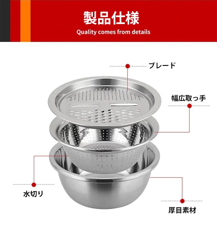 多機能水切り3点セットは、省スペース設計でキッチンを整理。耐久性素材と簡単な水切り機能で日常の調理を効率化。